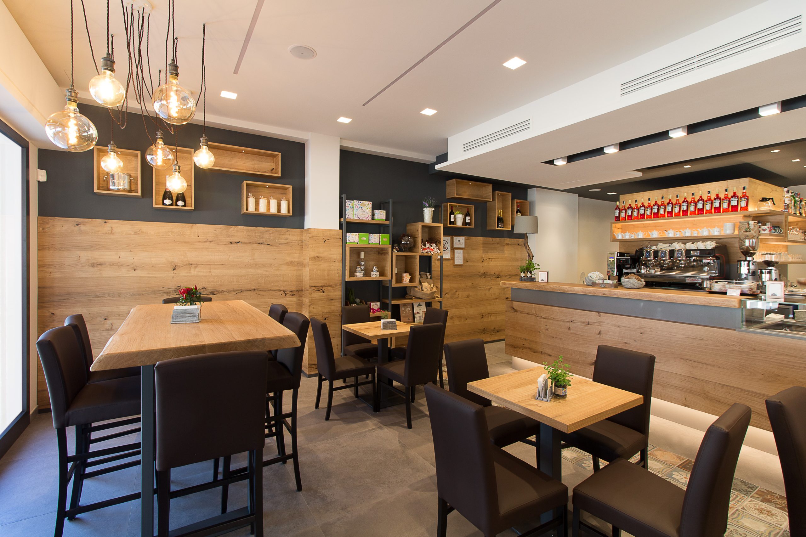 La parte retrostante al bancone, invece, coniuga il lato estetico con la funzionalità attraverso l’utilizzo di box in legno di diverse forme e dimensioni per l’esposizione di bottiglie, bicchieri, frutta per le spremute e materiale per il confezionamento.